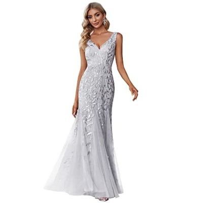 Women's Formal Dress Sequin Tulle Double V-Neck Sleeveless Mermaid Long Evening Dress 07886