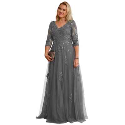 Women's 3/4 Sleeve Mother of The Bride Dresses 2025 Lace Applique Pleated Formal Party Dress DE222