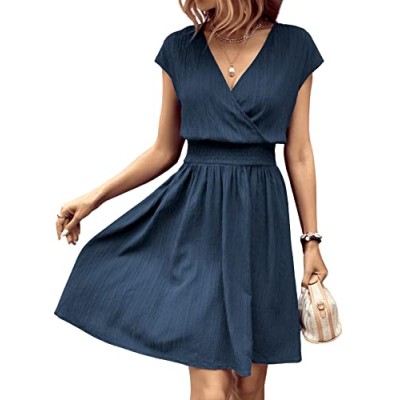 Women's Short Batwing Sleeve Cross Wrap V-Neck A-line Casual Swing Dress Plain Shirred Flared Short Dress