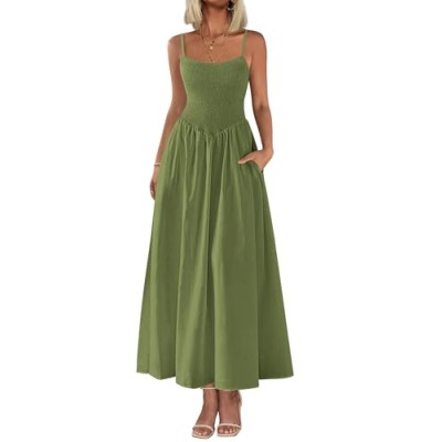 Women's Smocked Maxi Dresses 2025 Summer Beach Sundress Casual Spaghetti Strap Swing A Line Long Flowy Dress