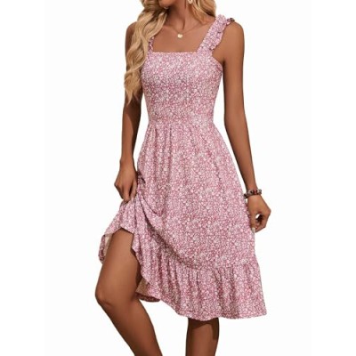 Womens Summer Midi Dress 2025 Elastic Straps Square Neck Cute Floral Flowy A-line Sundresses for Women