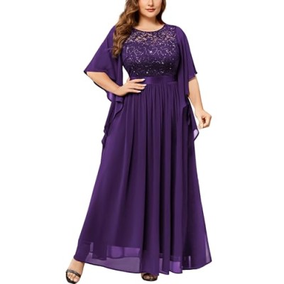 Women's Plus Size Sequin Lace with Ruffle Cape Cloak Sleeves Elegant Evening Wedding Party Maxi Dress