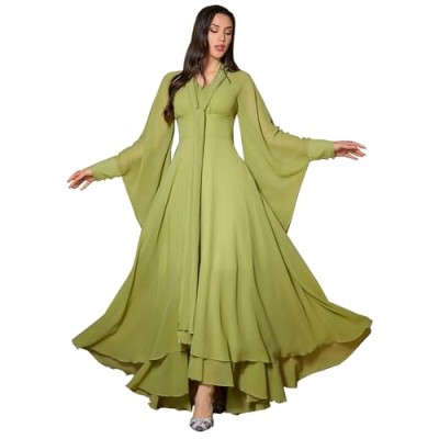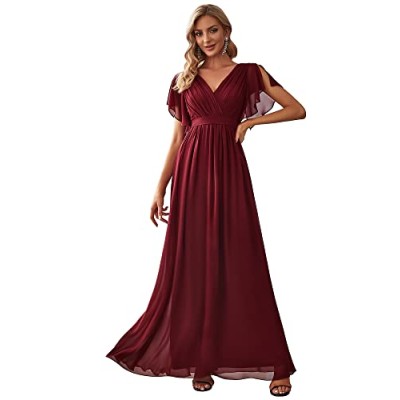Women's Bridesmaid Dress V-Neck Ruffle Sleeves Ruched Bust Floor Length Chiffon Formal Dresses 0164A