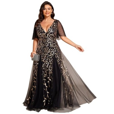 Womens Plus Size V-Neck Sequin Emboridery Formal Evening Dresses with Sleeves 00736-DA