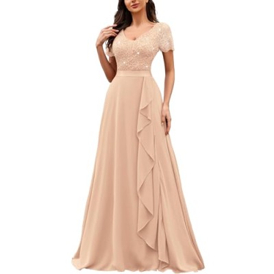 Women's Classy V-Neck Ruffle Floral Lace Hem Trim Sequined Maxi Bridesmaid Dress