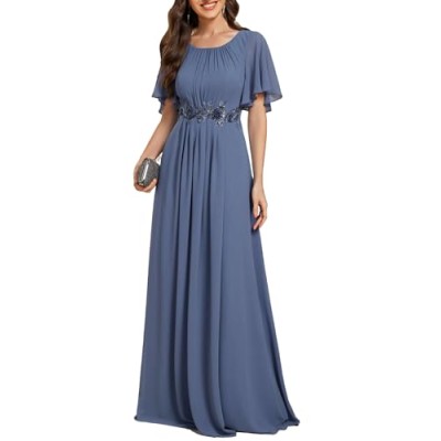 Women's Classic Round Neck Pleated Short Sleeves Chiffon Appliques Floor Length A Line Evening Dresses 02960