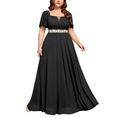 Women's Plus Size Floral Lace Ruffle Sleeves Beads Waist Chiffon Formal Party Maxi Dress