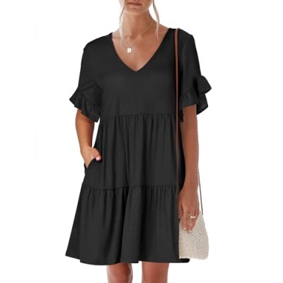 Dresses for Women Summer 2025 V Neck Ruffle Sleeve A Line Tiered Flowy Casual Trendy Mini Beach Dress with Pockets